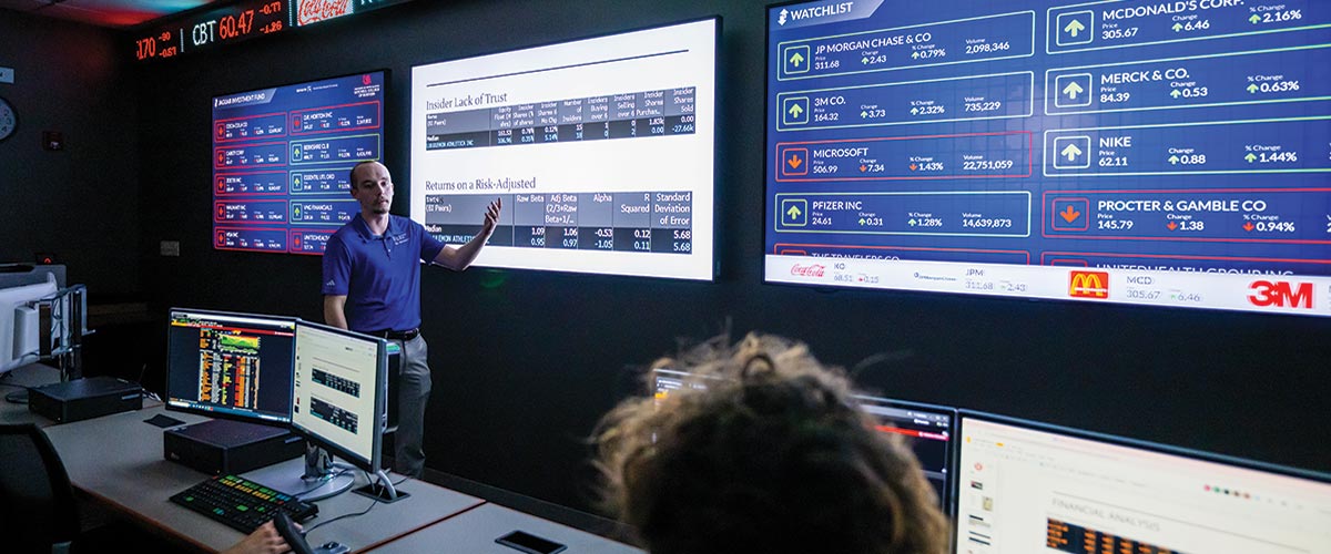 Student investment fund managers meet in the Finance Lab — aka the John B. Saint Financial Analysis Center — equipped with Bloomberg Terminal data workstations.